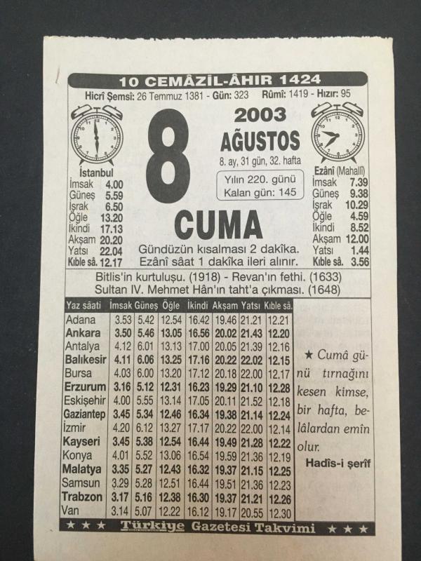 8 AĞUSTOS 2003-TAKVİM YAPRAĞI-DOĞUM GÜNÜ HEDİYESİ-TÜRKİYE GAZETESİ TAKVİMİ,BİTLİSİN KURTULUŞU,1918,REVANIN FETHİ 1633,4.MEHMET İN TAHTA ÇIKMASI 1648,HARAMLARDAN SAKINMAK, en son 8 ay önce güncellenmiştir.