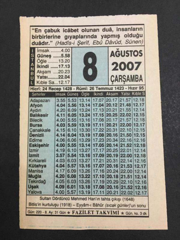 8 AĞUSTOS 2007 -TAKVİM YAPRAĞI-DOĞUM GÜNÜ HEDİYESİ-FAZİLET TAKVİMİ,4.MEHMED İN TAHTA ÇIKIŞI 1648,BİTLİSİN KURTULUŞU 1918,EYYAMI BAHUR UN SONU,ÇOCUĞA BİR ŞEY VERECEĞİM DEYİP VERMEMEK YALANDIR,SULTAN 4.MEHMED HAN