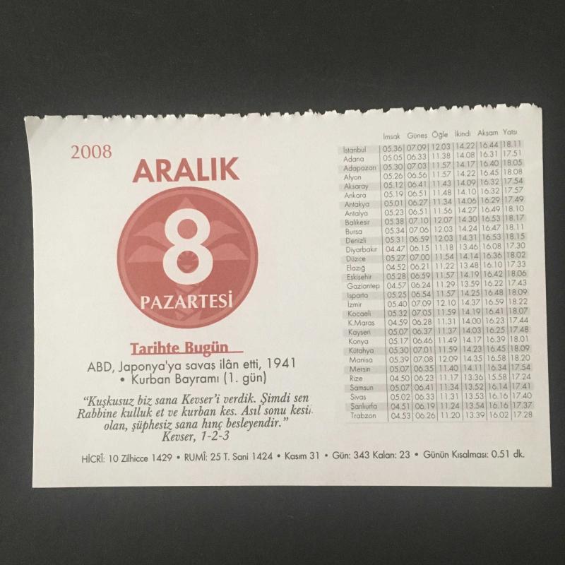 8 ARALIK 2008 -TAKVİM YAPRAĞI-DOĞUM GÜNÜ HEDİYESİ-KUVEYT TÜRK TAKVİMİ,ABD JAPONYAYA SAVAŞ İLAN ETTİ 1941,KURBAN BAYRAMI 1.GÜN,KURBAN BAYRAMI başlıklı ürün, Efemera, Müzik, Sinema > Belge ve Evraklar > Takvimler kategorisi altında İkinci El olarak satılmaktadır.