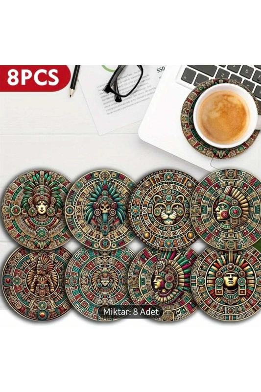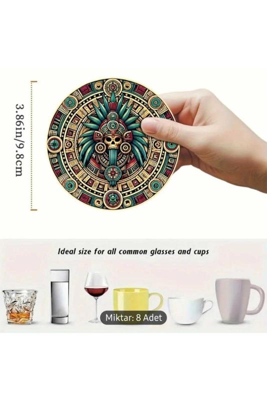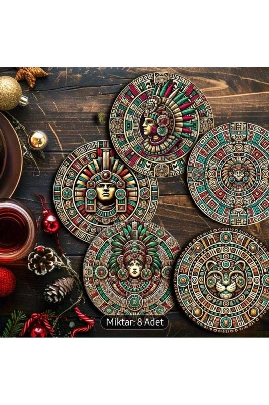 8 Adet Ahşap Bardak Altlığı Aztek Mayalar Temalı.; Sıcak ve soğuk dayanıklı.; Kaydırmaz.; Güzel resimli tasarımlı bardak altlıkları.; 10cm çap.