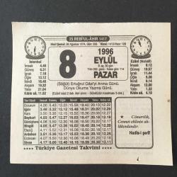 8 EYLÜL 1996 -TAKVİM YAPRAĞI-DOĞUM GÜNÜ HEDİYESİ-TÜRKİYE GAZETESİ TAKVİMİ,SÖĞÜT ERTUĞRUL GAZİYİ ANMA GÜNÜ,DÜNYA OKUMA YAZMA GÜNÜ,CANIM KURBAN,ÇOCUK AŞILARI, en son 8 ay önce güncellenmiştir.