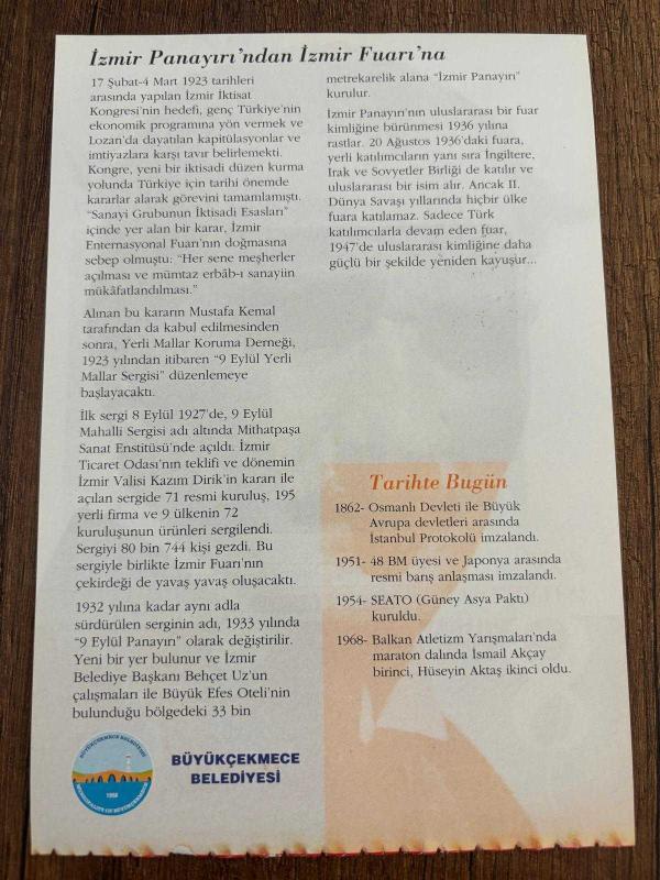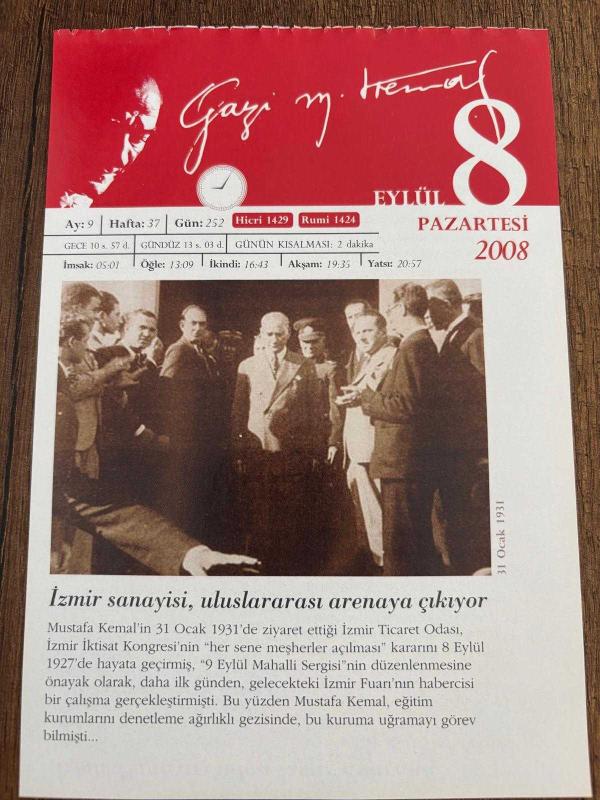 8 EYLÜL 2008 - TAKVİM YAPRAĞI - DOĞUM GÜNÜ HEDİYESİ - GAZİ MUSTAFA KEMAL ATATÜRK FOTOĞRAFLI BÜYÜKÇEKMECE BELEDİYESİ TAKVİMİ - İzmir sanayisi, uluslararası arenaya çıkıyor - İzmir Panayırı'ndan İzmir Fuarı'na - 1862- Osmanlı Devleti ile Büyük Avrupa devletleri arasında İstanbul Protokolü imzalandı. - 1951- 48 BM üyesi ve Japonya arasında resmi barış anlaşması imzalandı. - 1954- SEATO (Güney Asya Paktı) kuruldu. -, en son 9 ay önce güncellenmiştir.