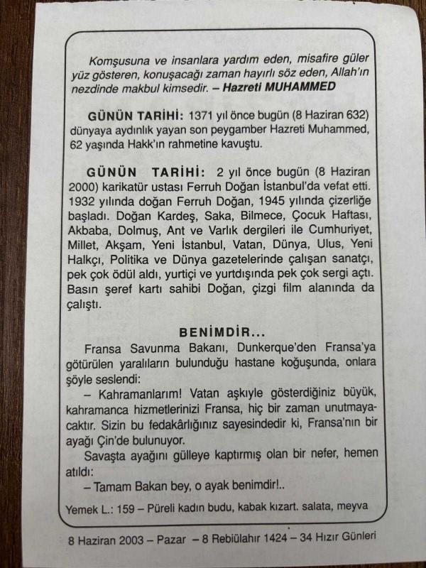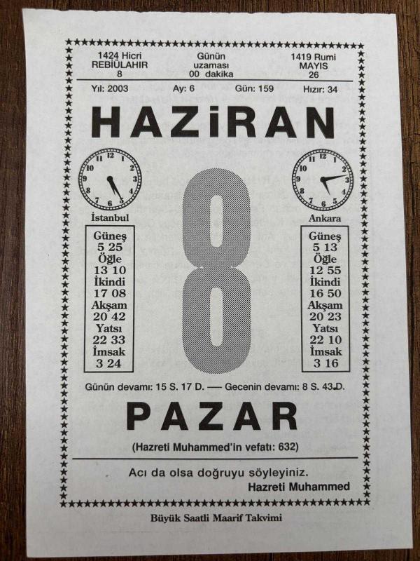 8 HAZİRAN 2003 - TAKVİM YAPRAĞI - DOĞUM GÜNÜ HEDİYESİ - BÜYÜK SAATLİ MAARİF TAKVİMİ - HZ.MUHAMMED - HZ.MUHAMMED'İN VEFATI - KARİKATÜR USTASI FERRUH DOĞAN VEFAT ETTİ - BENİMDİR, en son 8 ay önce güncellenmiştir.