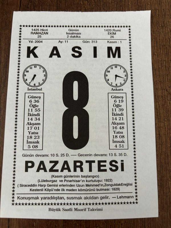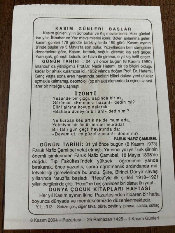 8 KASIM 2004 - TAKVİM YAPRAĞI - DOĞUM GÜNÜ HEDİYESİ - BÜYÜK SAATLİ MAARİF TAKVİMİ - LEHMANN - KASIM GÜNLERİ BAŞLAR - PROF. DR. NADİR HATEMİ VEFAT ETTİ - FARUK NAFİZ ÇAMLIBEL - ŞAİR FARUK NAFİZ ÇAMLIBEL VEFAT ETTİ - DÜNYA ÇOCUK KİTAPLARI HAFTASI, en son 8 ay önce güncellenmiştir.