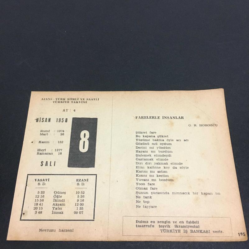 8 NİSAN 1958 -TAKVİM YAPRAĞI-DOĞUM GÜNÜ HEDİYESİ- AJANS-TÜRK ŞİİRLİ VE SAATLİ TÜRKİYE TAKVİMİ,O.R.HOROZCU,YAŞAR KEMAL,FAL,FIKRA,HASAN PAŞANIN AZLİ 1598,GÜZEL SÖZ,YEMEK LİSTESİ başlıklı ürün, Efemera, Müzik, Sinema > Belge ve Evraklar > Takvimler kategorisi altında İkinci El olarak satılmaktadır.