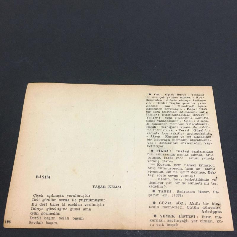 8 NİSAN 1958 -TAKVİM YAPRAĞI-DOĞUM GÜNÜ HEDİYESİ- AJANS-TÜRK ŞİİRLİ VE SAATLİ TÜRKİYE TAKVİMİ,O.R.HOROZCU,YAŞAR KEMAL,FAL,FIKRA,HASAN PAŞANIN AZLİ 1598,GÜZEL SÖZ,YEMEK LİSTESİ, 1 yıl önce satışa sunulmuştur.