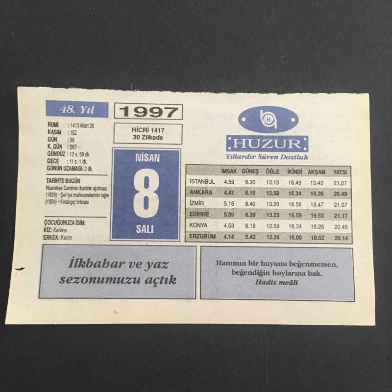 8 NİSAN 1997 -TAKVİM YAPRAĞI-DOĞUM GÜNÜ HEDİYESİ-HUZUR TAKVİMİ,NUSRETİYE CAMİİ NİN İBADETE AÇILMASI,1826,ŞER İYE MAHKEMELERİNİN LAĞVI 1924,KIRLANGIÇ FIRTINASI,ÇOCUĞUNUZA İSİM,ANNE VE ÇOCUK,EN BÜYÜK HATA,SEVGİ VE HOŞGÖRÜ başlıklı ürün, Efemera, Müzik, Sinema > Belge ve Evraklar > Takvimler kategorisi altında İkinci El olarak satılmaktadır.