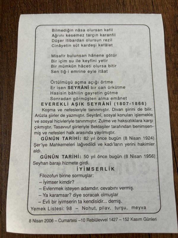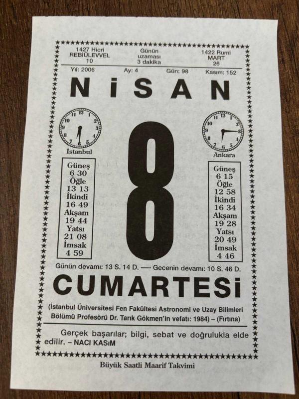 8 NİSAN 2006 - TAKVİM YAPRAĞI - DOĞUM GÜNÜ HEDİYESİ - BÜYÜK SAATLİ MAARİF TAKVİMİ - NACİ KASIM - EVEREKLİ AŞIK SEYRANİ - SEYHAN BARAJI HİZMETE GİRDİ - ŞER'İYE MAHKEMELERİ LAV EDİLDİ KADILARIN YERİNİ HAKİMLER ALDI, 5 ay önce satışa sunulmuştur.