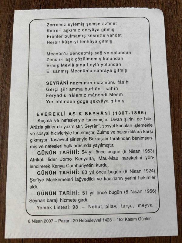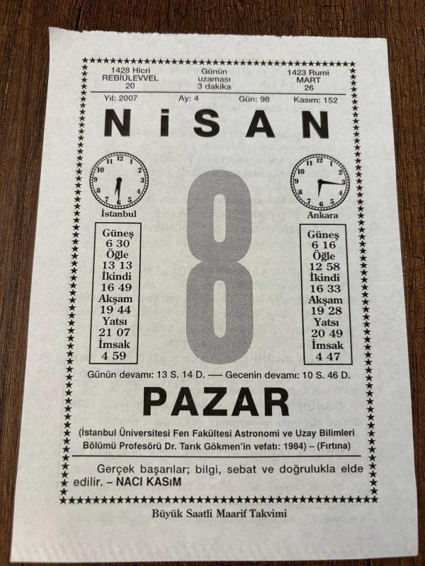 8 NİSAN 2007 - TAKVİM YAPRAĞI - DOĞUM GÜNÜ HEDİYESİ - BÜYÜK SAATLİ MAARİF TAKVİMİ - NACİ KASIM - EVEREKLİ AŞIK SEYRANİ - SEYHAN BARAJI HİZMETE GİRDİ - ŞER'İYE MAHKEMELERİ LAV EDİLDİ KADILARIN YERİNİ HAKİMLER ALDI, 5 ay önce satışa sunulmuştur.