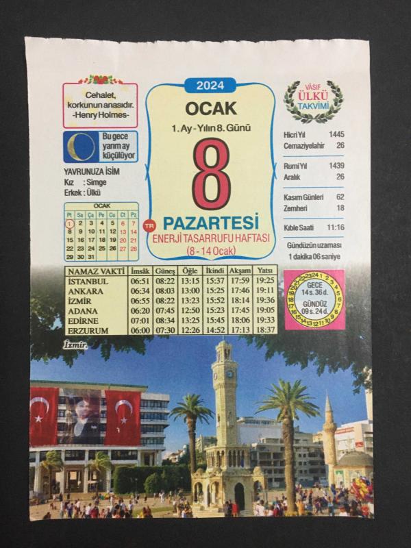 8 OCAK 2024 -TAKVİM YAPRAĞI-DOĞUM GÜNÜ HEDİYESİ-VASIF ÜLKÜ TAKVİMİ,İZMİR,YAVRUNUZA İSİM,ERZİN HATAY FRANSIZ İŞGALİNDEN KURTULDU,1922,KARŞIYAKA MÜFTÜSÜ NADİR KURUNUN DAVETİYLE KADINLAR ERKEKLERLE BERABER SAF TUTTU,GÖREME AÇIK HAVA MÜZESİ,GİYECEK MODA DEĞİLDİR,GERÇEK HAMSİLİ PİLAV, en son 8 ay önce güncellenmiştir.