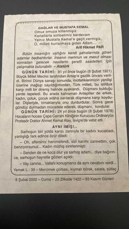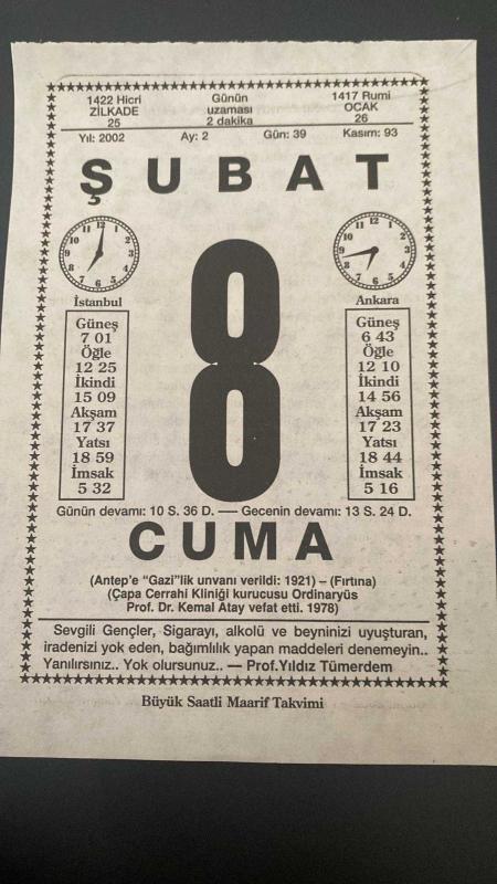 8 ŞUBAT 2002 - TAKVİM YAPRAĞI - DOĞUM GÜNÜ HEDİYESİ - BÜYÜK SAATLİ MAARİF TAKVİMİ - PROF. YILDIZ TÜMERDEM - ARİF HİKMET PAR - ATATÜRK - ANTEP'E GAZİLİK ÜNVANI VERİLMESİ - PRF. DR. AHMET KEMAL ATAY'IN VEFATI - AYNI İMİŞ ADLI KISA YAZI, en son 8 ay önce güncellenmiştir.