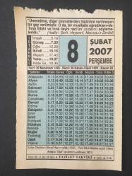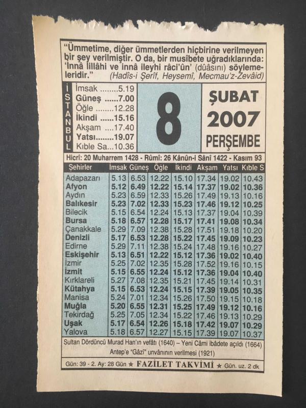 8 ŞUBAT 2007 -TAKVİM YAPRAĞI-DOĞUM GÜNÜ HEDİYESİ-FAZİLET TAKVİMİ,4.MUTAD IN VEFATI,1640,YENİ CAMİİ İBADETE AÇILDI, 1664,ANTEP E GAZİ ÜNVANI VERİLDİ 1921,HZ İDRİS ALEYHİSSELAM,MUCİZE GÖRMEYİ BEKLEMEK, başlıklı ürün, Efemera, Müzik, Sinema > Belge ve Evraklar > Takvimler kategorisi altında İkinci El olarak satılmaktadır.