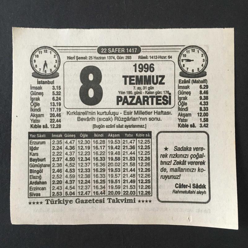8 TEMMUZ 1996 -TAKVİM YAPRAĞI-DOĞUM GÜNÜ HEDİYESİ-TÜRKİYE GAZETESİ TAKVİMİ,KIRKLARELİNİN KURTULUŞU,ESİR MİLLETLER HAFTASI,BEVARİH SICAK RÜZGARLARININ SONU,OSMANLI HANEDANI başlıklı ürün, Efemera, Müzik, Sinema > Belge ve Evraklar > Takvimler kategorisi altında İkinci El olarak satılmaktadır.