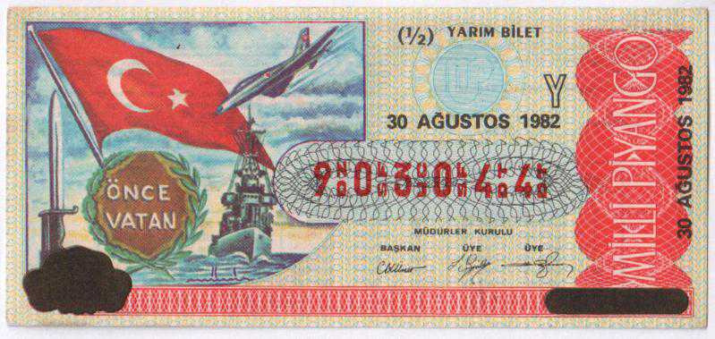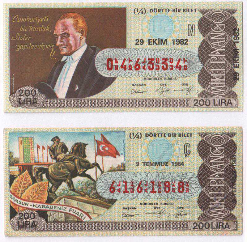 1980'li yılların başlarına ait Piyango biletleri: 30 Ağustos Zafer Bayramı, 9 Temmuz Samsun Fuarı, 29 Ekim Cumhuriyet Bayramı ve Önce Vatan temalı biletler.