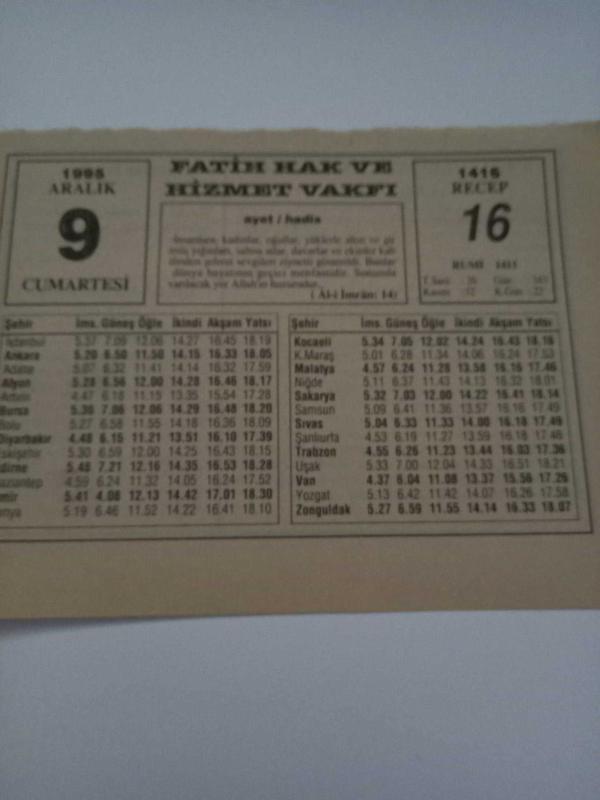 9 Aralık 1995-Orijinal Takvim Yaprağı-Doğum Günü-Söz,Nişan,Nikâh,Düğün ve Önemli Günler Hediyesi-Fatih Hak ve Hizmet Vakfı-Ayet/Hadis(Al-i İmran:14)-Cuma Namazı Sırasında Alış-Veriş-Seneca-Asprini Çiğneyin..., en son 4 ay önce güncellenmiştir.