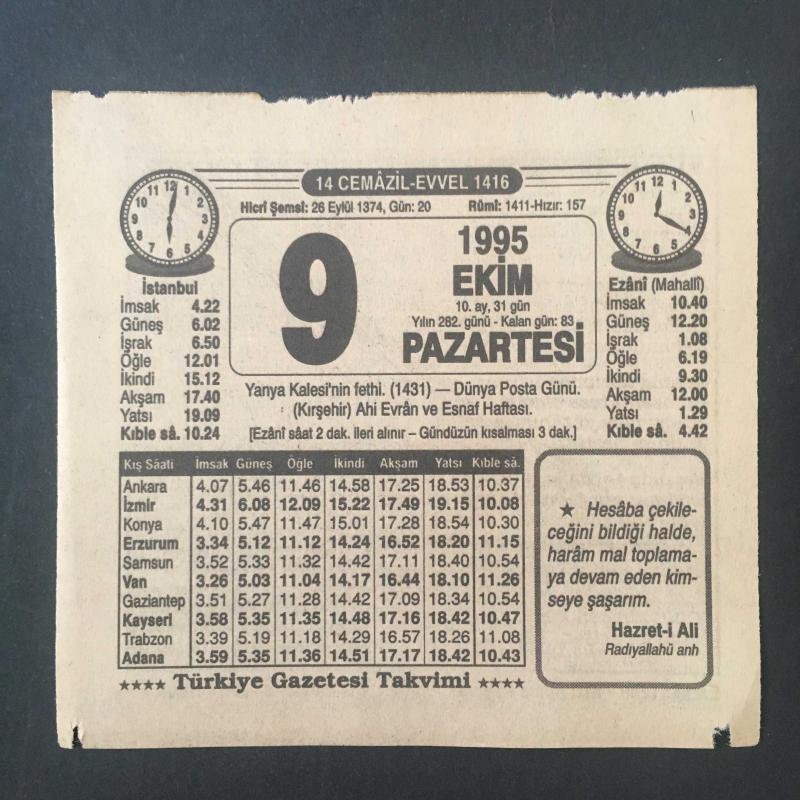 9 EKİM 1995 -TAKVİM YAPRAĞI-DOĞUM GÜNÜ HEDİYESİ-TÜRKİYE GAZETESİ TAKVİMİ,YANYA KALESİNİN FETHİ,1431,DÜNYA POSTA GÜNÜ,KIRŞEHİR AHİ EVRAN VE ESNAF HAFTASI,AHİLİK PRENSİPLERİ başlıklı ürün, Efemera, Müzik, Sinema > Belge ve Evraklar > Takvimler kategorisi altında İkinci El olarak satılmaktadır.