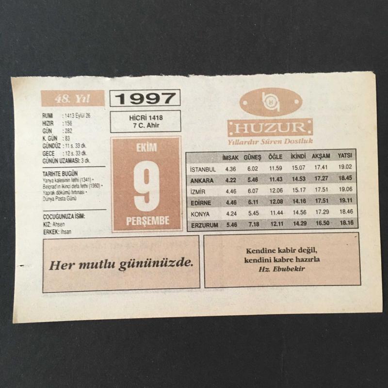 9 EKİM 1997 -TAKVİM YAPRAĞI-DOĞUM GÜNÜ HEDİYESİ-HUZUR TAKVİMİ,YANYA KALESİNİN FETHİ,1341,BELGRADIN 2.DEFA FETHİ,YAPRAK DÖKÜMÜ FIRTINASI,DÜNYA POSTA GÜNÜ,ÇOCUĞUNUZA İSİM,ZENGİNLİK ALLAHIN BİR İHSANIDIR başlıklı ürün, Efemera, Müzik, Sinema > Belge ve Evraklar > Takvimler kategorisi altında İkinci El olarak satılmaktadır.