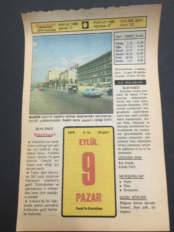 9 EYLÜL 1979-TAKVİM YAPRAĞI-DOĞUM GÜNÜ HEDİYESİ-HÜRRİYET TAKVİMİ,ÇOCUĞA İSİM,EVDE ÇİÇEK LALE,İZMİRİN ,BORNOVA,MENEMENİN EDREMİTİN KURTULUŞLARI,KONYADA CİRİT OYUNLARI,MUĞLADA YEŞİLYURT ÜZÜM YETİŞTİRME YARIŞMASI,NİKOGOS AĞANIN ÖLÜMÜ 1885, en son 8 ay önce güncellenmiştir.