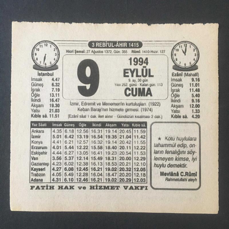 9 EYLÜL 1994 -TAKVİM YAPRAĞI-DOĞUM GÜNÜ HEDİYESİ-FATİH HAK VE HİZMET VAKFI TAKVİMİ,İZMİR EDREMİT VE MENEMENİN KURTULUŞLARI,1922,KEBAN BARAJININ HİZMETE GİRMESİ 1974,MÜSLÜMANIN 3 VAZİFESİ,STRESS başlıklı ürün, Efemera, Müzik, Sinema > Belge ve Evraklar > Takvimler kategorisi altında İkinci El olarak satılmaktadır.