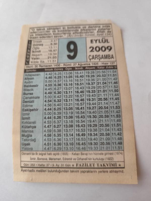 9 Eylül 2009-Orijinal Takvim Yaprağı-Doğum Günü-Söz,Nişan,Nikâh,Düğün ve Önemli Günler Hediyesi-Fazilet Takvimi-Ayet(Hadis)(Al-i İmran Suresi,ayet 134)-Osmanlı'da ilk telgraf hattı açıldı (1855)-Ehl-i Sünnetin Amelde Mezhepleri-Sadaka Hakkında Hadis-i Şerifler başlıklı ürün, Efemera, Müzik, Sinema > Belge ve Evraklar > Takvimler kategorisi altında İkinci El olarak satılmaktadır.