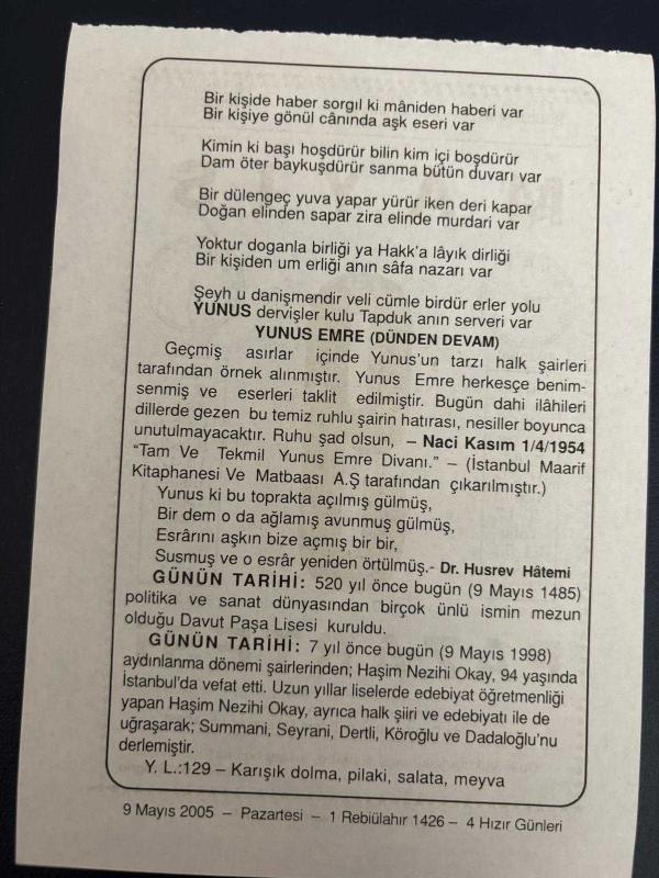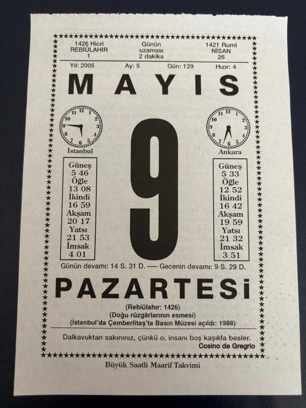 9 MAYIS 2005 - TAKVİM YAPRAĞI - DOĞUM GÜNÜ HEDİYESİ - BÜYÜK SAATLİ MAARİF TAKVİMİ - COSİNO DE GREGRİO - YUNUS EMRE - NACİ KASIM - DR.HÜSREV HATEMİ - DAVUT PAŞA LİSESİ KURULDU - ŞAİR HAŞİM NEZİHİ OKAY ÖLDÜ, 6 ay önce satışa sunulmuştur.