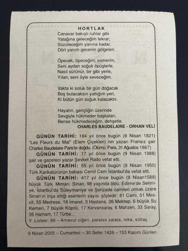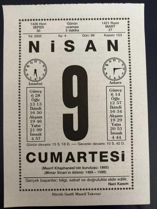 9 NİSAN 2005 - TAKVİM YAPRAĞI - DOĞUM GÜNÜ HEDİYESİ - BÜYÜK SAATLİ MAARİF TAKVİMİ - NACİ KASIM - ORHAN VELİ - YAZAR ŞEVKET RADO VEFAT ETTİ - KARİKATÜRİST CEMİL CEM VEFAT ETTİ - TÜRK MİMARI SİNAN VEFAT ETTİ, en son 8 ay önce güncellenmiştir.