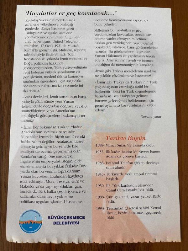 9 NİSAN 2008 - TAKVİM YAPRAĞI - DOĞUM GÜNÜ HEDİYESİ - GAZİ MUSTAFA KEMAL ATATÜRK FOTOĞRAFLI BÜYÜKÇEKMECE BELEDİYESİ TAKVİMİ - Sakarya Savaşı'na doğru - Haydutlar er geç kovulacak - 1588- Mimar Sinan 92 yaşında öldü - 1932- İlk kadın hakim Mürüvvet hanım Adana'da göreve başladı - 1936- İstanbul Telefon Şirketi devletçe satın alındı - 1945- Türkiye'de yerli ampul üretimi başladı - 1950- İlk Türk karikatürcülerinden Cemil Cem İstanbul'da öldü -1988- Şair, gazeteci, yazar Şevket Rado öldü - 1993- Tercüman gazetesi sahibi Kemal Ilıcak, beyin kanaması geçirerek öldü başlıklı ürün, Efemera, Müzik, Sinema > Belge ve Evraklar > Takvimler kategorisi altında İkinci El olarak satılmaktadır.