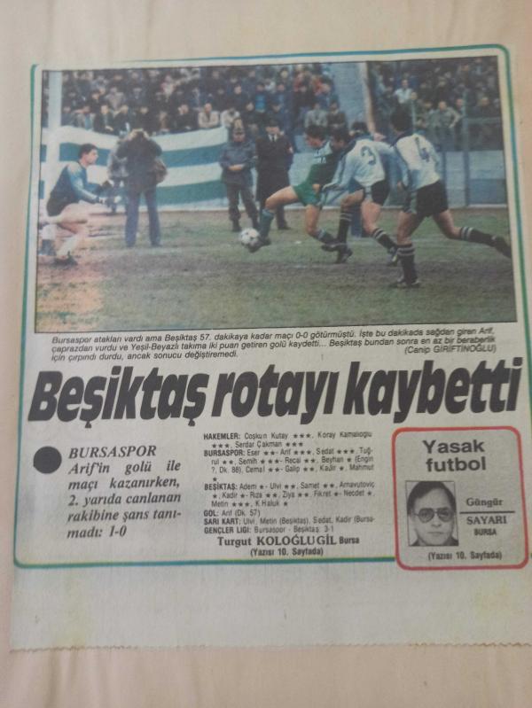 9 Nisan 1984 - Beşiktaş rotayı kaybetti - Bursaspor Arif'in golü ile maçı kazanırken, 2. yarıda canlanan rakibine şans tanımadı: 1-0 - Yasak futbol - Güngör Sayarı - Gazete haberi - Tek Yaprak Arkalı Önlüdür, Erol Duru tarafından kaleme alınmıştır. Kitap 1984 yılında yayınlanmıştır. 2 sayfadır. 9 Nisan 1984 - Beşiktaş rotayı kaybetti - Bursaspor Arif'in golü ile maçı kazanırken, 2. yarıda canlanan rakibine şans tanımadı: 1-0 - Yasak futbol - Güngör Sayarı - Gazete haberi - Tek Yaprak Arkalı Önlüdür adlı eser Türkçe dilindedir.
