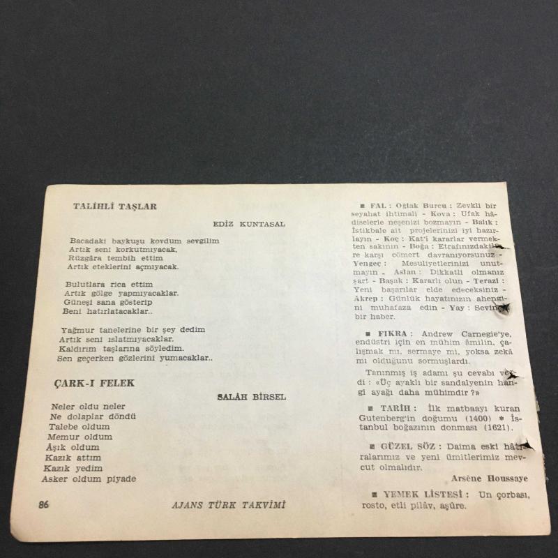 9 ŞUBAT 1960 -TAKVİM YAPRAĞI-DOĞUM GÜNÜ HEDİYESİ-AJANS TÜRK-ŞİİRLİ VE SAATLİ TAKVİMİ,ORHAN VELİ KANIK,ARİF DAMAR,EDİZ KUNTASAL,SALAH BİRSEL,FAL,FIKRA,GUTENBERGİN DOĞUMU 1400,İSTANBUL BOĞAZANIN DONMASI 1621GÜZEL SÖZ,YEMEK LİSTESİ, en son 8 ay önce güncellenmiştir.