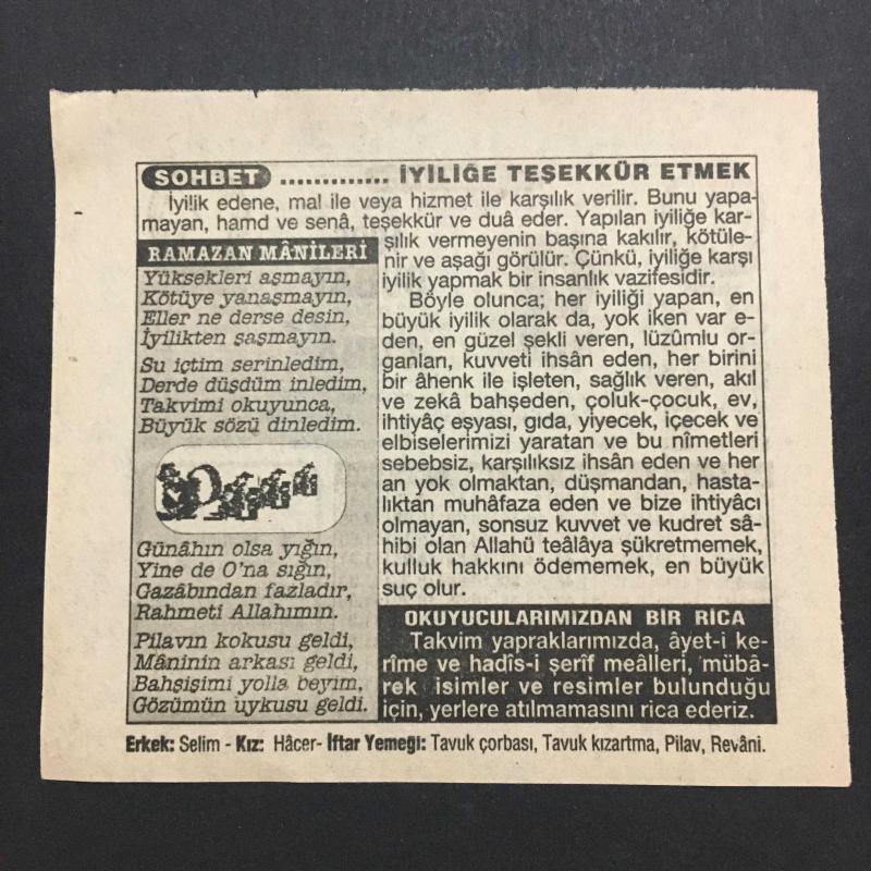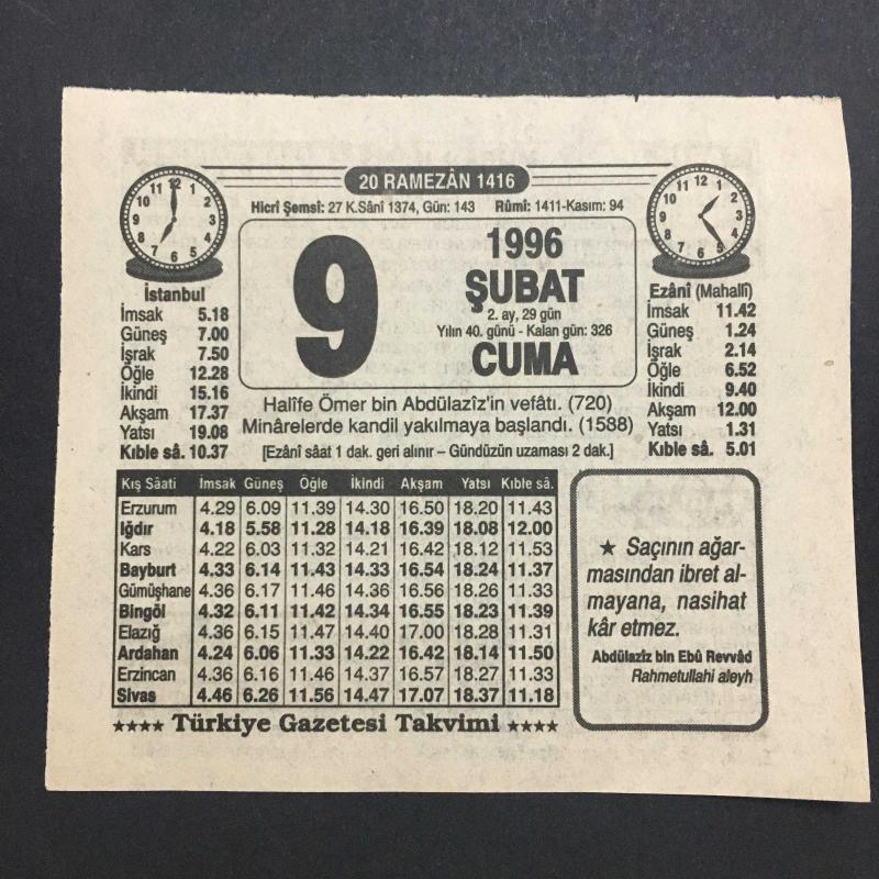 9 ŞUBAT 1996 -TAKVİM YAPRAĞI-DOĞUM GÜNÜ HEDİYESİ-TÜRKİYE GAZETESİ TAKVİMİ,HALİFE ÖMER BİN ABDULAZİZİN VEFATI 720,MİNARELERDE KANDİL YAKILMAYA BAŞLANDI 1588,İYİLİĞE TEŞEKKÜR ETMEK,RAMAZAN MANİLERİ, en son 8 ay önce güncellenmiştir.