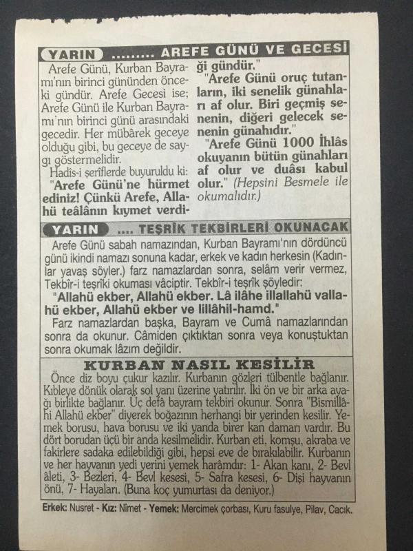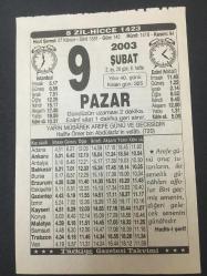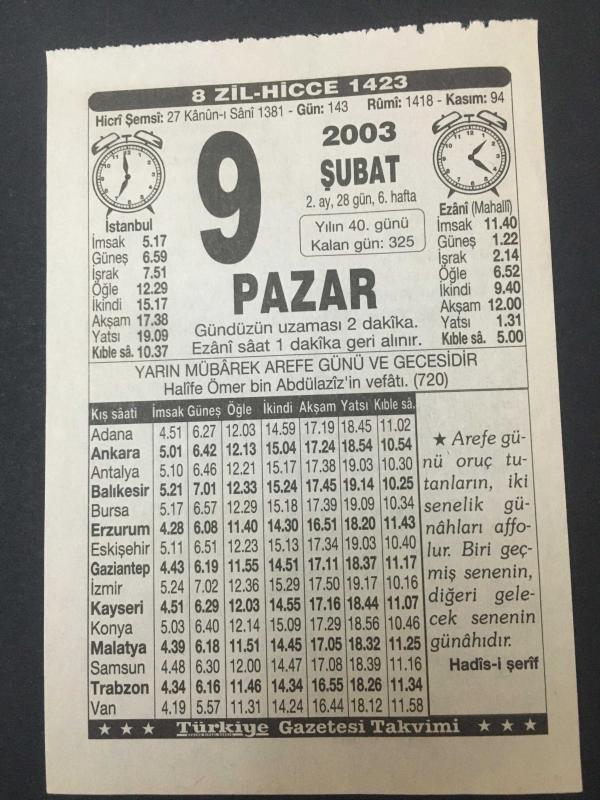 9 ŞUBAT 2003-TAKVİM YAPRAĞI-DOĞUM GÜNÜ HEDİYESİ-TÜRKİYE GAZETESİ TAKVİMİ,HALİFE ÖMER BİN ABDULAZİZİN VEFATI 720,KURBAN NASIL KESİLİR, en son 8 ay önce güncellenmiştir.