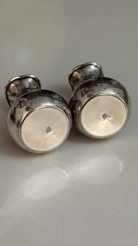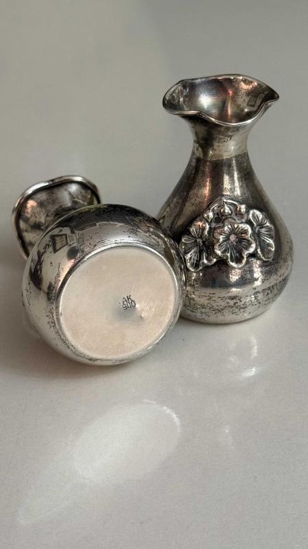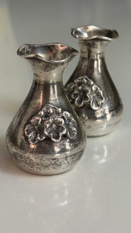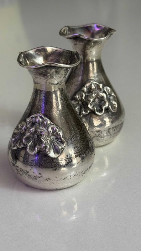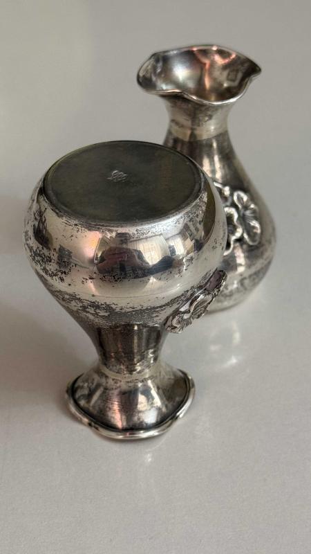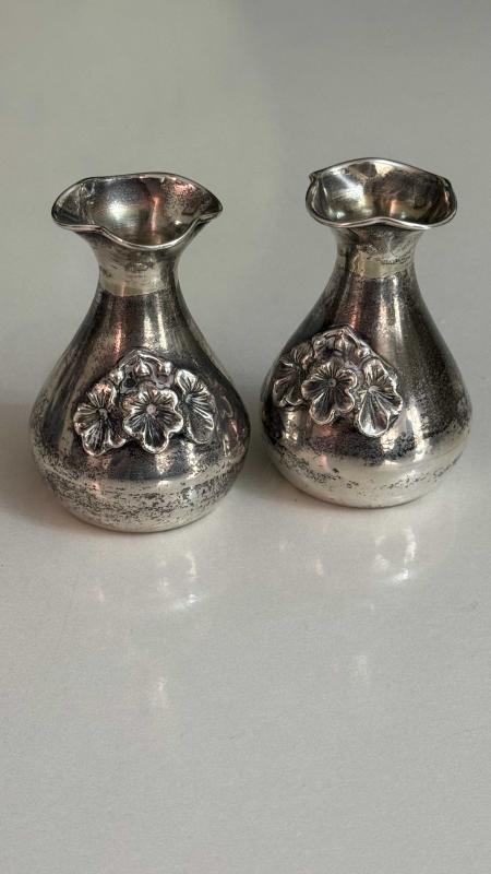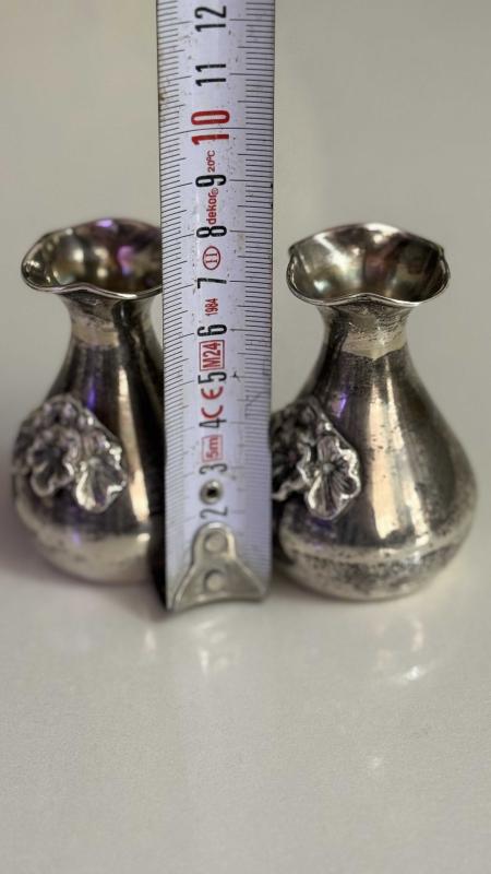 Kabartma çiçek 🌺 desenli aykırı formda çift takım 900 ayar damgalı gümüş kinyatur 119 gram Ağrlığında 7.santimetre boyunda gümüş vazo kusursuz tertemiz tam koleksiyonluk iki eser birden