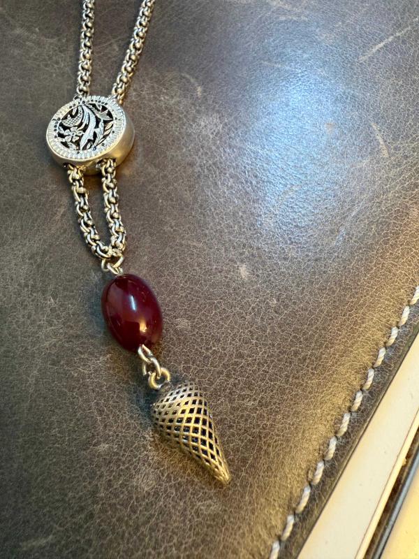 925 ayar gümüş arnavut zinciri ve gümüş parçalardan oluşan, vişne rengi sıkma kehribar taneli el yapımı anahtarlık. Boy: 13,5 cm. Ağırlık: 12,8 gramdır.