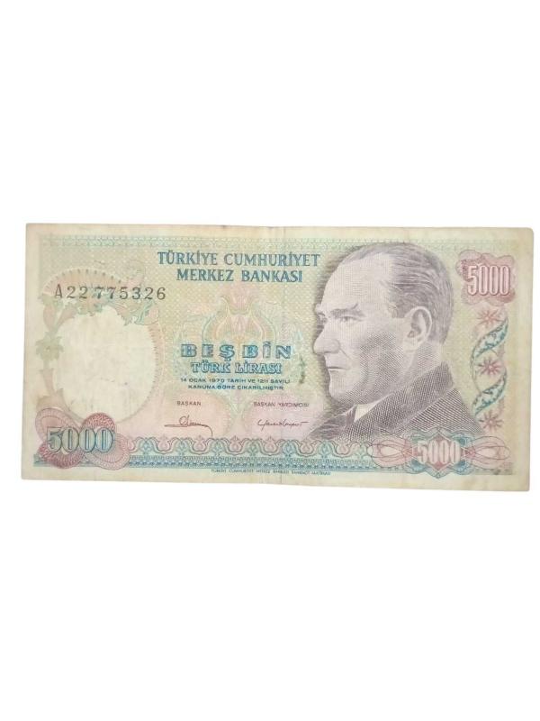 A 22 / 7. Emisyon 5000 Türk Lirası Değerli Seri Koleksiyon Cumhuriyet Dönemi Kağıt Para.