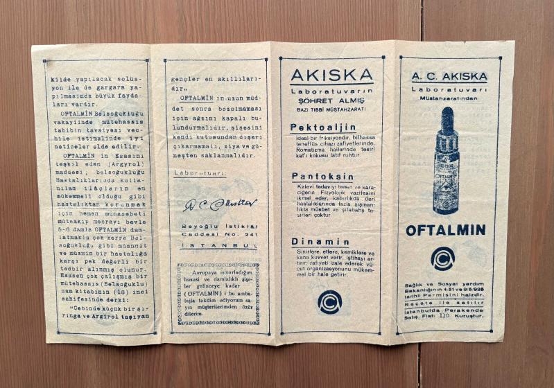 A. C. Akıska Laboratuvarı Oftalmin ilaç broşürü 20x31 cm.