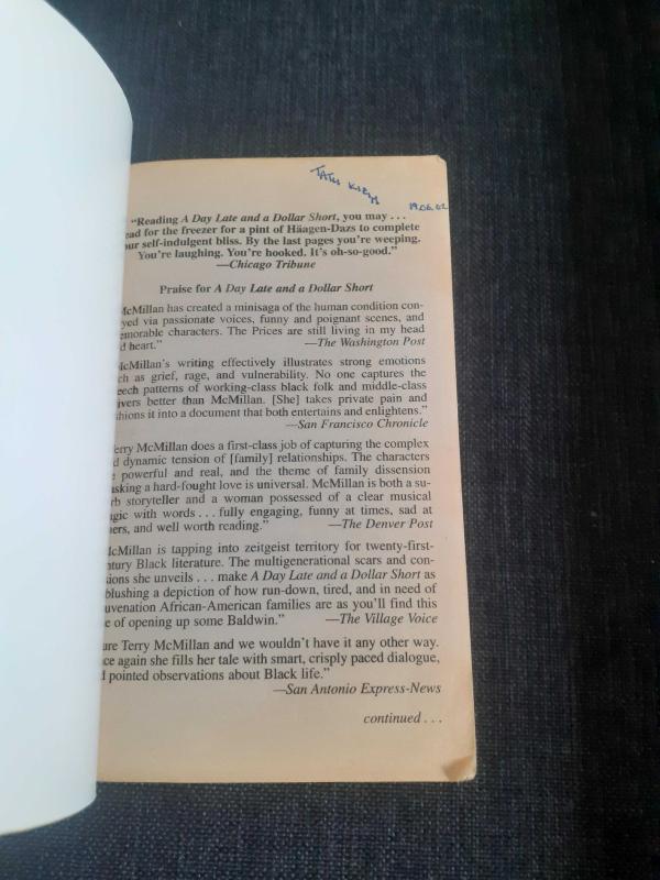 A Day Late and a Dollar Short, Terry McMillan tarafından kaleme alınmıştır. Kitap 2002 yılında A Signet Book tarafından yayınlanmıştır. 464 sayfadır. A Day Late and a Dollar Short adlı eser İngilizce dilindedir.