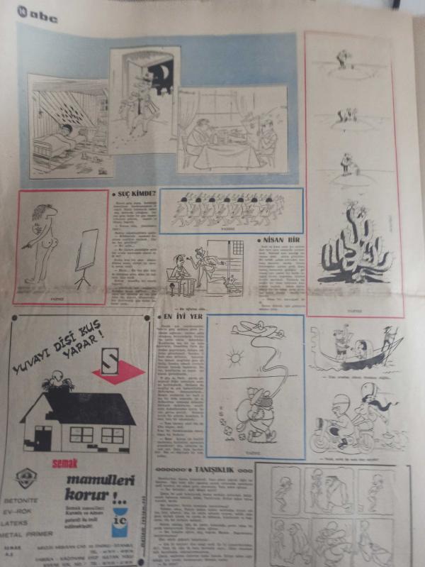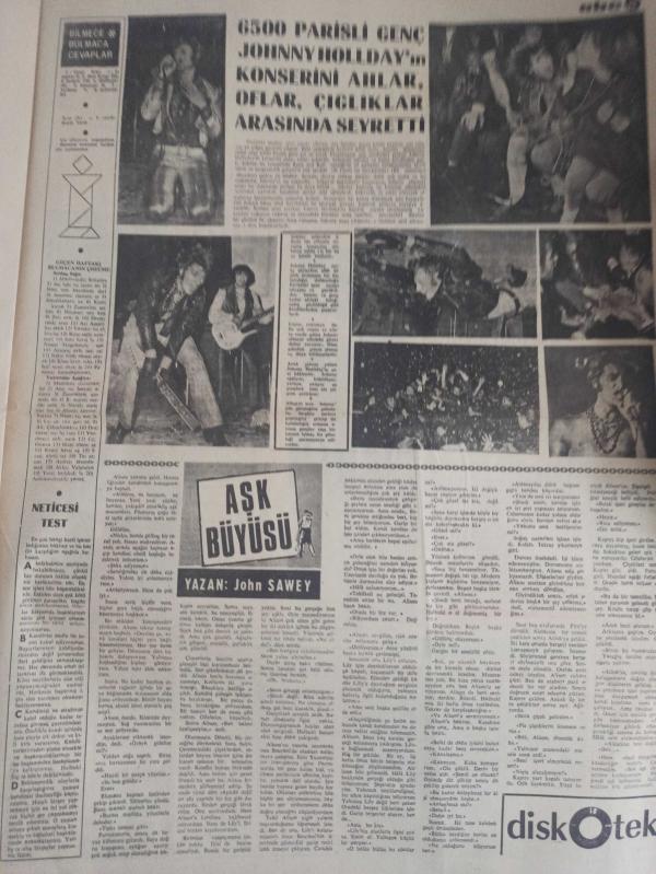 ABC Magazin Haftalık Aktüalite Sinema Tiyatro Müzik ve Magazin Gazetesi - Deniz Zorlu - Bedri Çapa - Özel Giray - Mehmet Beykont - Aytu Tamer - Nilgün Çiçek - Hamdi Şensöy - Şahap Koptagel - İrfan İnanç - Yıldızınız diyor ki - Bilmece Bulmaca Eğlence - Bundan Sonrası Ne Olacak - Mini Sosyete - Sedat Tuna - Gülriz Dilmaç - Ümit Yaşar Oğuzcan - Turhan Oğuzbaş - Nurhan Damcıoğlu - Ayfer Feray - Nisa Serezli - Ahmet Gülhan - Dirilen Kedi - Alfred Hitchcock - Zarif Bir Kadın - Sis daha da artmıştı genç kadın cesedi delikten aşağı itti - Suç Kimde - Nisan 1 - 6500 Paris'li Genç Johnny Hollday'ın konserini ahlar, oflar, çığlıklar arasında seyretti - Aşk Büyüsü - John Sawey - Ve Hülya Koçyiğit, Seman Özcan'ın rolünü elinden aldı - Ekrem Bora cele döndü - Ajda Pekkan nihayet araba aldı - Yıldız Tezcan'ın filmi - Türkan Şoray'a yine boyun eğdiler - Sevinç Pekin Yok oldu - Belgin Doruk Olayı - Murat Soydan, af dileyince Rüçhan Adlı insafa geldi - Gazete Tam Değildir Sadece 8 Sayfası Mevcuttur Yıpranma, sararmalar, kupon kesiği ve yırtılmalar zamana bağlı olarak görülebilir