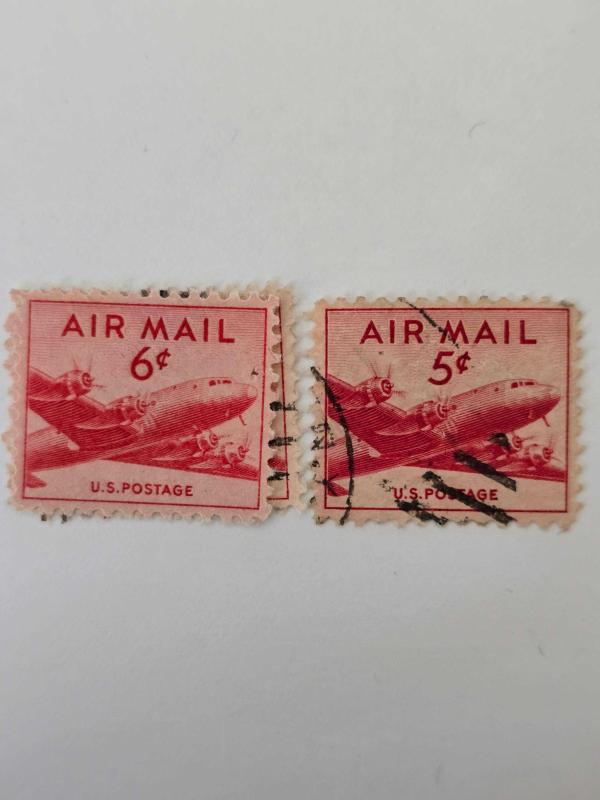 Lot.2 Amerika Birleşik Devletleri (U.S. POSTAGE) hava postası (AIR MAIL) pullarıdır ve üzerlerinde çift motorlu bir nakliye uçağı (Twin-Motored Transport Plane) veya DC-4 Skymaster uçağı resmi bulunmaktadır. Pullar, genellikle 1940'lı yıllara ait iki ayrı emisyondan gelmektedir. ✈️ U.S. Air Mail 6¢ Pulu Değer: 6 Sent (6¢) Tasarım: Çift motorlu bir nakliye uçağı (Twin-Motored Transport Plane) veya DC-4 Skymaster. Renk: Karmen kırmızısı (Carmine Red). Emisyon Tarihi:1949 ✈️ U.S. Air Mail 5¢ Pulu Değer: 5 Sent (5¢) Tasarım: Çift motorlu bir nakliye uçağı (Twin-Motored Transport Plane) veya DC-4 Skymaster. Renk: Karmen kırmızısı (Carmine Red). Emisyon Tarihi:1948