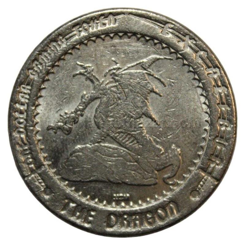 ABD, Excalibur Casino - MERLIN Las Vegas, Nevada Temalı 1 Dolarlık Oyun Jetonu 1990. Ön yüz: Taştaki Kılıç "Excalibur." Arka Yüz: Kilgharrah "Büyük Ejderha" Güçlü ve Kadim Bir Ejderhadır. Bin Yıldan Daha Yaşlı Olduğu Söylenir. Merlin'in Akıl Hocası, Arkadaşı ve Manevi Kardeşiydi. "Bir Dolarlık Oyun Jetonu Excalibur, NCM, Dragon ve Merlin." 1990'dan Beri Las Vegas Casino NV'deki Excalibur Casino'da Kullanılıyor. Nikel-Gümüş (21,75 gr/37,2 mm)