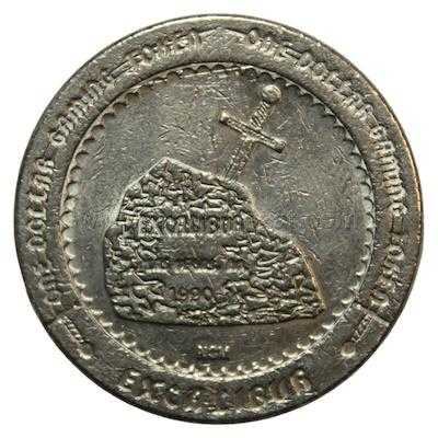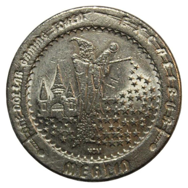 ABD, Excalibur Casino - MERLIN Las Vegas, Nevada Temalı 1 Dolarlık Oyun Jetonu 1990. Ön yüz: Taştaki Kılıç "Excalibur." Arka Yüz: "Merlin" Arka Planda Bir Kalenin Önünde Yıldız Büyüsü Yapıyor. "Bir Dolarlık Oyun Jetonu Excalibur, NCM, Arthur, Guinevre ve Merlin." 1990'dan Beri Las Vegas Casino NV'deki Excalibur Casino'da Kullanılıyor. Nikel-Gümüş (21,75 gr/37,2 mm)