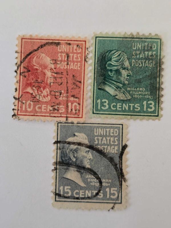 Lot.3 Amerika Birleşik Devletleri'nin 1938 yılında basılan ünlü Başkanlık Serisi (Presidential Issue)'ne aittir. 10 Cent John Tyler (10. Başkan) Kırmızı/Gül Scott #815 29 Ağustos 1938 13 Cent Millard Fillmore (13. Başkan) Mavi-Yeşil Scott #818 22 Eylül 1938 15 Cent James Buchanan (15. Başkan) Mavi-Gri Scott #820 13 Ekim 1938 Bu seride, her değerde bir ABD Başkanı (ve 1/2 cent ve 1 1/2 cent için sırasıyla Benjamin Franklin ve Martha Washington) tasvir edilmiştir. Presidential Serisi Hakkında Kısa Bilgi Seri Adı: Başkanlık Serisi (Presidential Issue) veya halk arasında "Prexies" olarak bilinir. Emisyon Yılı: 1938 yılında basılmaya başlanmıştır. Özellik: 1/2 cent'ten 5 dolara kadar olan değerlerde, o döneme kadar yaşamış olan tüm ABD Başkanları kronolojik sırayla (değer artışına göre) tasvir edilmiştir. Tasarım: Bu pulların ayırt edici özelliği, her pulda başkanın adı ve görev yılları yerine yalnızca değer, "UNITED STATES POSTAGE" yazısı ve başkanın portresinin bulunmasıdır (ancak Millard Fillmore ve James Buchanan pullarınızda ismin ve görev yıllarının basılı olduğunu görebilirsiniz, bu bazı yüksek değerler için yapılmıştır).
