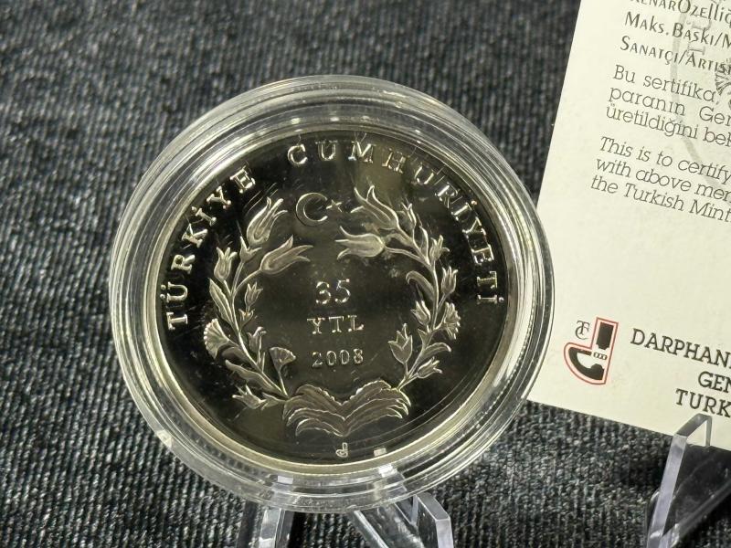 AC - Anıtkabir 70. Yıl Hatıra Gümüş Para 2008 – Sertifikalı, Çil Cumhuriyetimizin simge yapılarından Anıtkabir’in 70. yılı anısına, 2008 yılında Darphane tarafından basılan bu özel hatıra gümüş para, hem tarihi hem de kültürel anlamda yüksek bir değere sahip koleksiyon parçasıdır. 🌟 Tasarım Detayları • Ön Yüz: Türkiye Cumhuriyeti ibaresi, 2008 yılı damgası, 20 Yeni Türk Lirası nominal değeri ve çevresinde zarif desenler. • Arka Yüz: Anıtkabir’in etkileyici mimarisi detaylı şekilde işlenmiş olup, altında “Anıtkabir’in 70. Yılı” ibaresi yer almaktadır. 🔹 Teknik Özellikler • Metal: 925 Ayar Gümüş • Çap: 38.61 mm • Ağırlık: 23.33 gram • Baskı: Proof (ayna parlaklığında, yüksek darp kalitesiyle) • Kenar: Tırtıllı • Durum: Çil – Sertifikalı 📜 Sertifikalı Koleksiyon Parçası Bu özel hatıra parası, orijinal sertifikasıyla birlikte gelmektedir. Sertifika, paranın otantik olduğunu ve sınırlı sayıda üretildiğini garanti eder. 🎯 Koleksiyon Değeri • Türkiye Cumhuriyeti’nin kurucusu Mustafa Kemal Atatürk’ün ebedi istirahatgâhı olan Anıtkabir’in 70. yılı şerefine basılan bu para, yalnızca gümüş değeriyle değil, tarihsel ve manevi değeriyle de ön plana çıkar. • Atatürk temalı ve Cumhuriyet hatırası koleksiyonların en özel parçalarından biridir. • Sertifikalı olması sayesinde koleksiyon değerini uzun yıllar korur. ⸻ Bu hatıra para, Cumhuriyet tarihimize duyulan saygıyı ve Anıtkabir’in simgesel değerini yansıtan nadir bir koleksiyon parçası olarak öne çıkmaktadır.