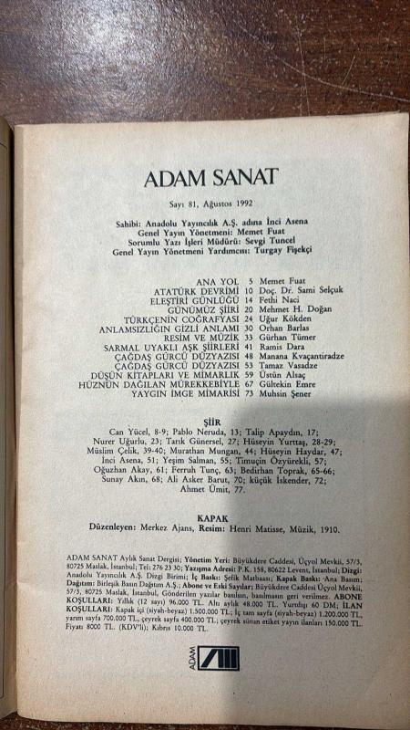 ADAM SANAT DERGİSİ - AĞUSTOS 1992 SAYI: 81 DOÇ. DR. SAMİ SELÇUK - FETHİ NACİ - MEHMET H. DOĞAN - UĞUR KÖKDEN - SEVGİ TUNCEL - ORHAN BARLAS - GÜRHAN TÜMER - RAMİS DARA - MANANA KVAÇANTİRADZE - TAMAZ VASADZE - ÜSTÜN ALSAÇ - GÜLTEKİN EMRE - MUHSİN ŞENER - CAN YÜCEL - PABLO NERUDA - TALİP APAYDIN - NURER UĞURLU - TARIK GÜNERSEL - HÜSEYİN YURTTAŞ - MÜSLİM ÇELİK - MURATHAN MUNGAN - HÜSEYİN HAYDAR - YEŞİM SALMAN - TİMUÇİN ÖZYÜREKLİ - OĞUZHAN AKAY - FERRUH TUNÇ - BEDİRHAN TOPRAK - SUNAY AKIN - ALİ ASKER BARUT - KÜÇÜK İSKENDER - AHMET ÜMİT - HENRI MATISSE SANAT - ANA YOL - ATATÜRK DEVRİMİ - ELEŞTİRİ GÜNLÜĞÜ - GÜNÜMÜZ ŞİİRİ - TÜRKÇENİN COĞRAFYASI - ANLAMSIZLIĞIN GİZLİ ANLAMI - RESİM VE MÜZİK - SARMAL UYAKLI AŞK ŞİİRLERİ - ÇAĞDAŞ GÜRCÜ DÜZYAZISI - DÜŞÜN KİTAPLARI VE MİMARLIK - HÜZNÜN DAĞILAN MÜREKKEBİYLE - YAYGIN İMGE MİMARİSİ - 80 SAYFA, ANADOLU YAYINCILIK A.Ş İNCİ ASENA tarafından kaleme alınmıştır. Eser MEMET FUAT editörlüğünde hazırlanmıştır. Kitap . tarafından [ŞEFİK MATBAACILIK] yayınlanmıştır. 80 sayfadır. ADAM SANAT DERGİSİ - AĞUSTOS 1992 SAYI: 81 DOÇ. DR. SAMİ SELÇUK - FETHİ NACİ - MEHMET H. DOĞAN - UĞUR KÖKDEN - SEVGİ TUNCEL - ORHAN BARLAS - GÜRHAN TÜMER - RAMİS DARA - MANANA KVAÇANTİRADZE - TAMAZ VASADZE - ÜSTÜN ALSAÇ - GÜLTEKİN EMRE - MUHSİN ŞENER - CAN YÜCEL - PABLO NERUDA - TALİP APAYDIN - NURER UĞURLU - TARIK GÜNERSEL - HÜSEYİN YURTTAŞ - MÜSLİM ÇELİK - MURATHAN MUNGAN - HÜSEYİN HAYDAR - YEŞİM SALMAN - TİMUÇİN ÖZYÜREKLİ - OĞUZHAN AKAY - FERRUH TUNÇ - BEDİRHAN TOPRAK - SUNAY AKIN - ALİ ASKER BARUT - KÜÇÜK İSKENDER - AHMET ÜMİT - HENRI MATISSE SANAT - ANA YOL - ATATÜRK DEVRİMİ - ELEŞTİRİ GÜNLÜĞÜ - GÜNÜMÜZ ŞİİRİ - TÜRKÇENİN COĞRAFYASI - ANLAMSIZLIĞIN GİZLİ ANLAMI - RESİM VE MÜZİK - SARMAL UYAKLI AŞK ŞİİRLERİ - ÇAĞDAŞ GÜRCÜ DÜZYAZISI - DÜŞÜN KİTAPLARI VE MİMARLIK - HÜZNÜN DAĞILAN MÜREKKEBİYLE - YAYGIN İMGE MİMARİSİ - 80 SAYFA adlı eser Türkçe dilindedir.