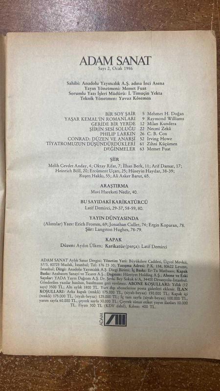 ADAM SANAT DERGİSİ - OCAK 1986 SAYI: 2 YAŞAR KEMAL - RAYMOND WILLIAMS - MEHMET H. DOĞAN - IRVING HOWE - ATIF DEMİRCİ - İNCİ ASENA - MEMET FUAT - İ. TİMUÇİN YEKTA - YAVUZ KÖSEMEN - MILAN KUNDERA - NECMİ ZEKÂ - C. B. COX - ZİHNİ KÜÇÜMEN - MELİH CEVDET ANDAY - OKTAY RIFAT - İLHAN BERK - ARİF DAMAR - HEINRICH BÖLL - ERCÜMENT UÇARI - HÜSEYİN HAYDAR - RUŞEN HAKKI - ALİ ASKER BARUT - LATİF DEMİRCİ - ERICH FROMM - JONATHAN CULLER - ERGİN KOPARAN - LANGSTON HUGHES - AYDIN ÜLKEN YAŞAR KEMAL'İN ROMANLARI - BİR SOY ŞAİR - CONRAD: DÜZEN VE ANARŞI - MAVİ HAREKETİ NEDİR - GERİDE BİR YERDE - ŞİİRİN SESİ SOLUĞU - TİYATROMUZUN DÜŞÜNDÜRDÜKLERİ - DEĞİNMELER - ŞİİR - ARAŞTIRMA - BU SAYIDAKİ KARİKATÜRCÜ - YAYIN DÜNYASINDA - KAPAK - ABONE KOŞULLARI - İLAN KOŞULLARI - 80 SAYFA, ANADOLU YAYINCILIK A.Ş İNCİ ASENA tarafından kaleme alınmıştır. Eser MEMET FUAT editörlüğünde hazırlanmıştır. Kitap . tarafından [ŞEFİK MATBAACILIK] yayınlanmıştır. 80 sayfadır. ADAM SANAT DERGİSİ - OCAK 1986 SAYI: 2 YAŞAR KEMAL - RAYMOND WILLIAMS - MEHMET H. DOĞAN - IRVING HOWE - ATIF DEMİRCİ - İNCİ ASENA - MEMET FUAT - İ. TİMUÇİN YEKTA - YAVUZ KÖSEMEN - MILAN KUNDERA - NECMİ ZEKÂ - C. B. COX - ZİHNİ KÜÇÜMEN - MELİH CEVDET ANDAY - OKTAY RIFAT - İLHAN BERK - ARİF DAMAR - HEINRICH BÖLL - ERCÜMENT UÇARI - HÜSEYİN HAYDAR - RUŞEN HAKKI - ALİ ASKER BARUT - LATİF DEMİRCİ - ERICH FROMM - JONATHAN CULLER - ERGİN KOPARAN - LANGSTON HUGHES - AYDIN ÜLKEN YAŞAR KEMAL'İN ROMANLARI - BİR SOY ŞAİR - CONRAD: DÜZEN VE ANARŞI - MAVİ HAREKETİ NEDİR - GERİDE BİR YERDE - ŞİİRİN SESİ SOLUĞU - TİYATROMUZUN DÜŞÜNDÜRDÜKLERİ - DEĞİNMELER - ŞİİR - ARAŞTIRMA - BU SAYIDAKİ KARİKATÜRCÜ - YAYIN DÜNYASINDA - KAPAK - ABONE KOŞULLARI - İLAN KOŞULLARI - 80 SAYFA adlı eser Türkçe dilindedir.
