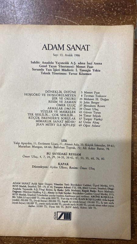 ADAM SANAT DERGİSİ -SAYI : 13 – ARALIK 1986 MEMET FUAT – TZVETAN TODOROV – MEHMET H. DOĞAN – JOHN BERGER – MENAHEM ROSEN – ÖMER ULUÇ – GÜVEN TURAN – TIMUR SELÇUK – TURGAY FİŞEKÇİ – ÜSTÜN ALSAÇ – OĞUZ ADANIR – TALİP APAYDIN – ERCÜMENT UÇARI – AHMET ADA – KÜÇÜK İSKENDER – MURATHAN MUNGAN – BEDİRHAN TOPRAK – ALİ ASKER BARUT – AYDIN ÜLKEN – TURGUT ÇEVİKER DÖNEKLİK ÜSTÜNE – HOŞGÖRÜ VE HOŞGÖRÜLMEYEN – ŞİİR VE OKURU – RESİM VE ZAMAN – ARMALAR (1967-74) – YÜZLER VE MASKELER – TEK SESLİLİK / ÇOK SESLİLİK – KÜÇÜK İSKENDER’E SORULAR – MİMARLIK SANAT MIDIR – JEAN MITRY İLE SÖYLEŞİ – GELİŞİM SÜRECİNDE TÜRK KARİKATÜRÜ I – ŞİİR – KAPAK - MEMET FUAT – TZVETAN TODOROV – MEHMET H. DOĞAN – JOHN BERGER – MENAHEM ROSEN – ÖMER ULUÇ – GÜVEN TURAN – TIMUR SELÇUK – TURGAY FİŞEKÇİ – ÜSTÜN ALSAÇ – OĞUZ ADANIR – TALİP APAYDIN – ERCÜMENT UÇARI – AHMET ADA – KÜÇÜK İSKENDER – MURATHAN MUNGAN – BEDİRHAN TOPRAK – ALİ ASKER BARUT – TURGUT ÇEVİKER – AYDIN ÜLKEN - DÖNEKLİK ÜSTÜNE – HOŞGÖRÜ VE HOŞGÖRÜLMEYEN - 80 SAYFA, ANADOLU YAYINCILIK A.Ş İNCİ ASENA tarafından kaleme alınmıştır. Eser MEMET FUAT editörlüğünde hazırlanmıştır. Kitap . tarafından [ŞEFİK MATBAACILIK] yayınlanmıştır. 80 sayfadır. ADAM SANAT DERGİSİ -SAYI : 13 – ARALIK 1986 MEMET FUAT – TZVETAN TODOROV – MEHMET H. DOĞAN – JOHN BERGER – MENAHEM ROSEN – ÖMER ULUÇ – GÜVEN TURAN – TIMUR SELÇUK – TURGAY FİŞEKÇİ – ÜSTÜN ALSAÇ – OĞUZ ADANIR – TALİP APAYDIN – ERCÜMENT UÇARI – AHMET ADA – KÜÇÜK İSKENDER – MURATHAN MUNGAN – BEDİRHAN TOPRAK – ALİ ASKER BARUT – AYDIN ÜLKEN – TURGUT ÇEVİKER DÖNEKLİK ÜSTÜNE – HOŞGÖRÜ VE HOŞGÖRÜLMEYEN – ŞİİR VE OKURU – RESİM VE ZAMAN – ARMALAR (1967-74) – YÜZLER VE MASKELER – TEK SESLİLİK / ÇOK SESLİLİK – KÜÇÜK İSKENDER’E SORULAR – MİMARLIK SANAT MIDIR – JEAN MITRY İLE SÖYLEŞİ – GELİŞİM SÜRECİNDE TÜRK KARİKATÜRÜ I – ŞİİR – KAPAK - MEMET FUAT – TZVETAN TODOROV – MEHMET H. DOĞAN – JOHN BERGER – MENAHEM ROSEN – ÖMER ULUÇ – GÜVEN TURAN – TIMUR SELÇUK – TURGAY FİŞEKÇİ – ÜSTÜN ALSAÇ – OĞUZ ADANIR – TALİP APAYDIN – ERCÜMENT UÇARI – AHMET ADA – KÜÇÜK İSKENDER – MURATHAN MUNGAN – BEDİRHAN TOPRAK – ALİ ASKER BARUT – TURGUT ÇEVİKER – AYDIN ÜLKEN - DÖNEKLİK ÜSTÜNE – HOŞGÖRÜ VE HOŞGÖRÜLMEYEN - 80 SAYFA adlı eser Türkçe dilindedir.