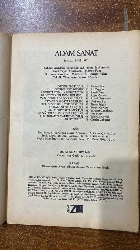 ADAM SANAT DERGİSİ -SAYI : 22 – AĞUSTOS 1987 MEMET FUAT – ALİ TAYGUN – RAMİS DARA – UMBERTO ECO – AYFER COŞKUN – ALFRED NEMECZEK – TIMUR SELÇUK – TURGUT ÇEVİKER – YAVUZER ÇETİNKAYA – JEAN MITRY – TAHİR M. CEYLAN – CHARLES OSBORNE – İLHAN BERK – ORHON MURAT ARIBURNU – CEVAT ÇAPAN – ERDAL ALOVA – EROL ÇANKAYA – TARIK GÜNERSEL – KÜÇÜK İSKENDER – ALİ ASKER BARUT – METİN GÖZ – AYDIN ÜLKEN – VINCENT VAN GOGH ÖZGÜR KÖTÜLÜK – DİL ÜSTÜNE SÖZ BİTMEZ – AMPHITRYON…AMPHITRYON – GÜNÇİÇEKLERİNİN HEPSİNİ SATTILAR – VAN GOGH’UN SON GÜNLERİ – TİYATRO GÖSTERİMİNİN GÖSTERGEBİLİMİ – TEK SESLİLİK / ÇOK SESLİLİK – RESSAM NURİ ABAÇ İLE JEAN MITRY’DEN MEKTUP – SANATÇILAR VE ZENAATÇILAR – FOTOĞRAFIN TARİHİNE GİRİŞ – KURT WEILL – ŞİİR – SUSIE PETSCHEK NERDESİN – POETİKA – KAPAK - 80 SAYFA, ANADOLU YAYINCILIK A.Ş İNCİ ASENA tarafından kaleme alınmıştır. Eser MEMET FUAT editörlüğünde hazırlanmıştır. Kitap . tarafından [ŞEFİK MATBAACILIK] yayınlanmıştır. 80 sayfadır. ADAM SANAT DERGİSİ -SAYI : 22 – AĞUSTOS 1987 MEMET FUAT – ALİ TAYGUN – RAMİS DARA – UMBERTO ECO – AYFER COŞKUN – ALFRED NEMECZEK – TIMUR SELÇUK – TURGUT ÇEVİKER – YAVUZER ÇETİNKAYA – JEAN MITRY – TAHİR M. CEYLAN – CHARLES OSBORNE – İLHAN BERK – ORHON MURAT ARIBURNU – CEVAT ÇAPAN – ERDAL ALOVA – EROL ÇANKAYA – TARIK GÜNERSEL – KÜÇÜK İSKENDER – ALİ ASKER BARUT – METİN GÖZ – AYDIN ÜLKEN – VINCENT VAN GOGH ÖZGÜR KÖTÜLÜK – DİL ÜSTÜNE SÖZ BİTMEZ – AMPHITRYON…AMPHITRYON – GÜNÇİÇEKLERİNİN HEPSİNİ SATTILAR – VAN GOGH’UN SON GÜNLERİ – TİYATRO GÖSTERİMİNİN GÖSTERGEBİLİMİ – TEK SESLİLİK / ÇOK SESLİLİK – RESSAM NURİ ABAÇ İLE JEAN MITRY’DEN MEKTUP – SANATÇILAR VE ZENAATÇILAR – FOTOĞRAFIN TARİHİNE GİRİŞ – KURT WEILL – ŞİİR – SUSIE PETSCHEK NERDESİN – POETİKA – KAPAK - 80 SAYFA adlı eser Türkçe dilindedir.