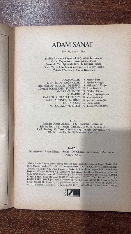 ADAM SANAT DERGİSİ - ŞUBAT 1989 SAYI: 39 HİLMİ BÜYÜKŞEKERCİ - OĞUZ ARAL - ÜSTÜN ALSAÇ - ERHAN TÜMER - SAMİM KOCAGÖZ - MEHMET H. DOĞAN - ASIM BEZİRCİ - VECİHİ TİMUROĞLU - YAVUZ KÖSEMEN - GÜRHAN TÜMER - VALERIO ADAMI - YAVUZER ÇETİNKAYA - İSKENDER FİKRET AKDORA - ERCÜMENT UÇARI - SAİT MADEN - ANDRÉ CHÉNIER - METİN ALTIÖK - REFİK DURBAŞ - TARIK GÜNERSEL - TİMUÇİN ÖZYÜREKLİ - KÜÇÜK İSKENDER - MUZAFFER KALE - AYDIN ÜLKEN - DE CHIRICO SANAT - DOGMACILIK - A. KADİR - ANDRÉ - ELEŞTİRİDE BAĞNAZLIK - BİR ŞİİR ANTOLOJİSİ ÜZERİNE - "GÜNEŞİ İÇENLERİN TÜRKÜSÜ" - SABRİ ALTINEL ÜZERİNE - KARANLIK OLAN HER ŞEY - OĞUZ ARAL - "OLGULAR" VE ÖTESİ - ŞİİR - BU SAYIDAKİ RESSAM - 80 SAYFA adlı eser, Kitap > Edebiyat, Kurgu > Edebiyat Bilimi kategorisinde İkinci El olarak satıştadır.