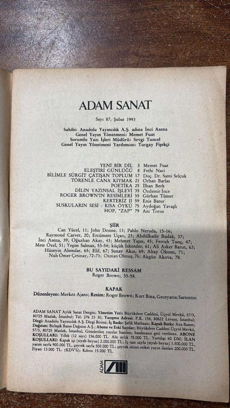 ADAM SANAT DERGİSİ - ŞUBAT 1993 SAYI: 87 FETHİ NACİ - İLHAN BERK - ÖZDEMİR İNCE - SEVGİ TUNCEL - DOÇ. DR. SAMİ SELÇUK - ORHAN BARLAS - GÜRHAN TÜMER - ENİS BATUR - AYDOĞAN YAVAŞLI - ANİ TOROS - ROGER BROWN - CAN YÜCEL - JOHN DONNE - PABLO NERUDA - RAYMOND CARVER - ERCÜMENT UÇARI - ABDÜLKADİR BUDAK - OĞUZHAN AKAY - MEHMET YAŞIN - FERRUH TUNÇ - METE ÖZEL - YEŞİM SALMAN - KÜÇÜK İSKENDER - ALİ ASKER BARUT - HÜSEYİN ALEMDAR - ELİF - SUNAY AKIN - ALTAY ÖKTEM - NUH ÖMER ÇETİNAY - OSMAN OLMUŞ - AKGÜN AKOVA - AYDIN ÜLKEN - YENİ BİR DİL - ELEŞTİRİ GÜNLÜĞÜ - ŞİİRİN SIFIR NOKTASI - DİLİN YAZINSAL İŞLEVİ - BİLİMLE SÜRGÜT ÇATIŞAN TOPLUM - TÖRENLE CANA KIYMAK - POETİKA - ROGER BROWN'IN RESİMLERİ - KERTERİZ II - SUSKULARIN SESİ: KISA ÖYKÜ - HOP, "ZAP" - 80 SAYFA, ANADOLU YAYINCILIK A.Ş İNCİ ASENA tarafından kaleme alınmıştır. Eser MEMET FUAT editörlüğünde hazırlanmıştır. Kitap . tarafından [ŞEFİK MATBAACILIK] yayınlanmıştır. 80 sayfadır. ADAM SANAT DERGİSİ - ŞUBAT 1993 SAYI: 87 FETHİ NACİ - İLHAN BERK - ÖZDEMİR İNCE - SEVGİ TUNCEL - DOÇ. DR. SAMİ SELÇUK - ORHAN BARLAS - GÜRHAN TÜMER - ENİS BATUR - AYDOĞAN YAVAŞLI - ANİ TOROS - ROGER BROWN - CAN YÜCEL - JOHN DONNE - PABLO NERUDA - RAYMOND CARVER - ERCÜMENT UÇARI - ABDÜLKADİR BUDAK - OĞUZHAN AKAY - MEHMET YAŞIN - FERRUH TUNÇ - METE ÖZEL - YEŞİM SALMAN - KÜÇÜK İSKENDER - ALİ ASKER BARUT - HÜSEYİN ALEMDAR - ELİF - SUNAY AKIN - ALTAY ÖKTEM - NUH ÖMER ÇETİNAY - OSMAN OLMUŞ - AKGÜN AKOVA - AYDIN ÜLKEN - YENİ BİR DİL - ELEŞTİRİ GÜNLÜĞÜ - ŞİİRİN SIFIR NOKTASI - DİLİN YAZINSAL İŞLEVİ - BİLİMLE SÜRGÜT ÇATIŞAN TOPLUM - TÖRENLE CANA KIYMAK - POETİKA - ROGER BROWN'IN RESİMLERİ - KERTERİZ II - SUSKULARIN SESİ: KISA ÖYKÜ - HOP, "ZAP" - 80 SAYFA adlı eser Türkçe dilindedir.