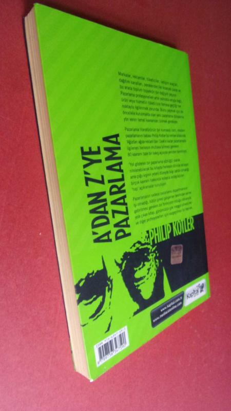 A'DAN Z'YE PAZARLAMA - PAZARLAMAYLA İLGİLENEN HERKESİN BİLMESİ GEREKEN 80 KAVRAM, PHILIP KOTLER tarafından kaleme alınmıştır. Kitap 2011 yılında MediaCat tarafından [İSTANBUL] yayınlanmıştır. Bu baskının çevirisi aslı Kalem Bokkal tarafından yapılmıştır. 209 sayfadır. A'DAN Z'YE PAZARLAMA - PAZARLAMAYLA İLGİLENEN HERKESİN BİLMESİ GEREKEN 80 KAVRAM adlı eser Türkçe dilindedir.