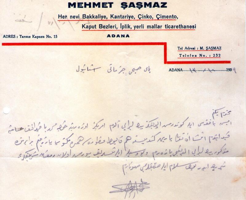 ADANA OSMANLICA FATURA . .1939 MEHMET ŞAŞMAZ İMZALI... .. MEHMET OFLAZ... ABDULLAH ÇINAR .. İSTANBUL, en son 3 gün önce güncellenmiştir.